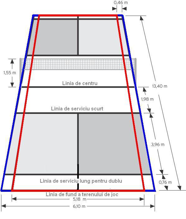 Terenul de joc este dreptunghiular, latura lunga masoara 13,40 metri, iar latimea 6,10 metri, la jocul de dublu, sau 5,18 metri, la jocul de simpu, diagonala intregului teren va fi de 14,723 metri.